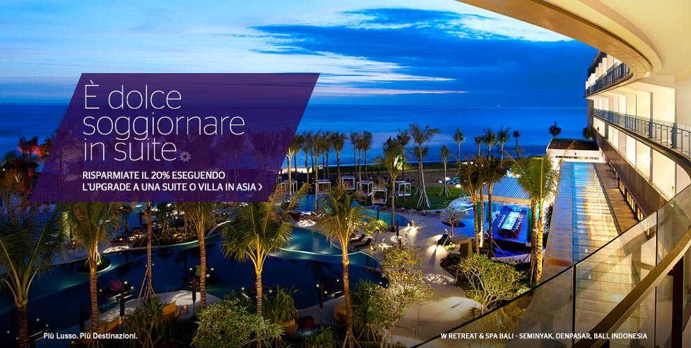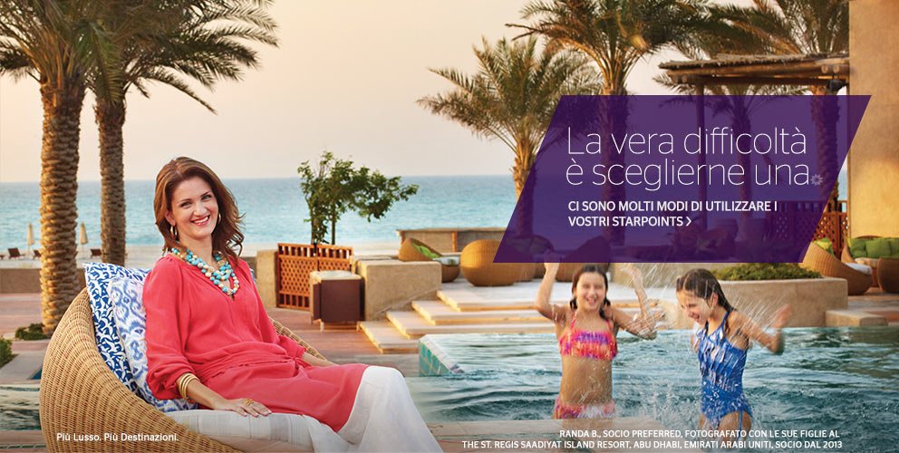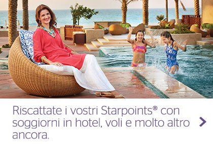 Accumulerete Starpoints® da usare per fantastici premi. Le Notti premio gratuite ci hanno resi celebri. Ricevete upgrade di camera, voli premio con oltre 350 compagnie aeree, articoli premio e altro ancora. La scelta, infinita, è nelle vostre mani.